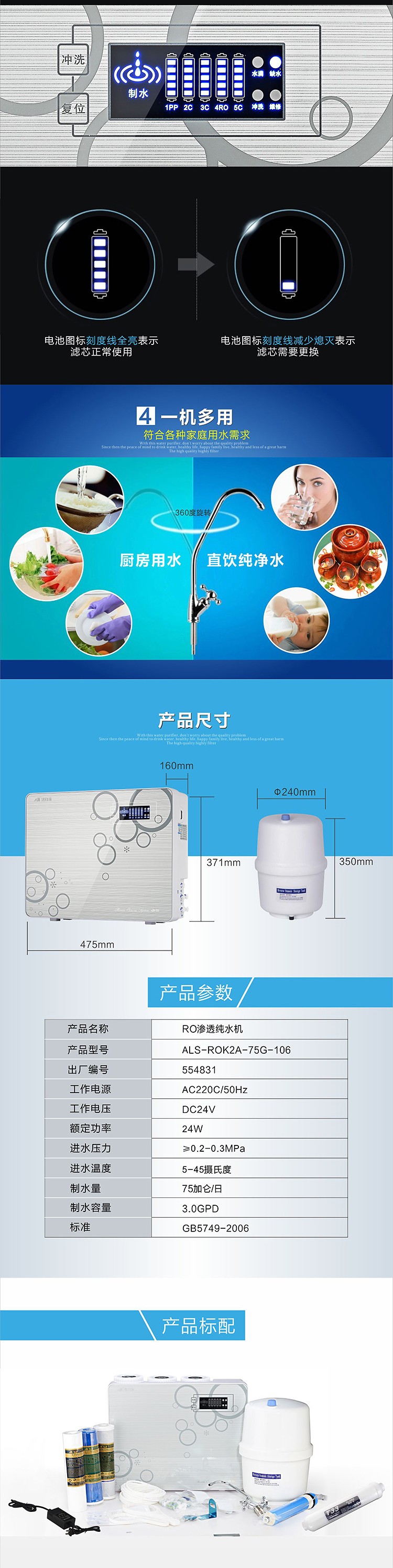 外观新颖:独特的现代化钢化玻璃面板设计,与反渗透技术完美融合,质感大气,更实用,彰显卓越品位。